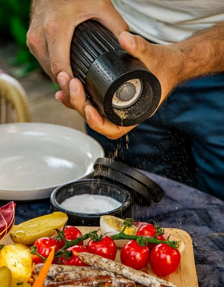 A sleek, high-quality pepper mill and black marble salt cellar set from the Matheson line (retail $150 USD). Features a smooth CrushGrind® mechanism, adjustable grind, and a nesting design that looks beautiful on any counter.